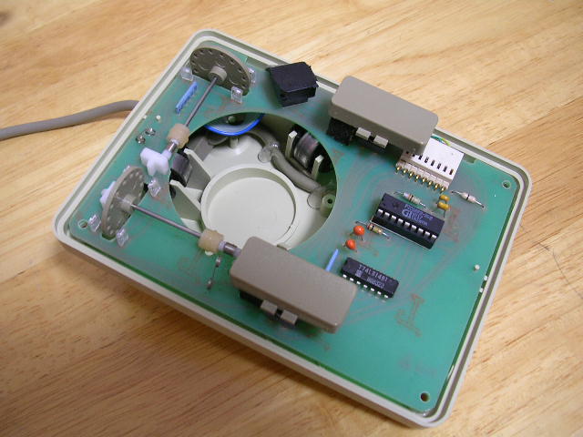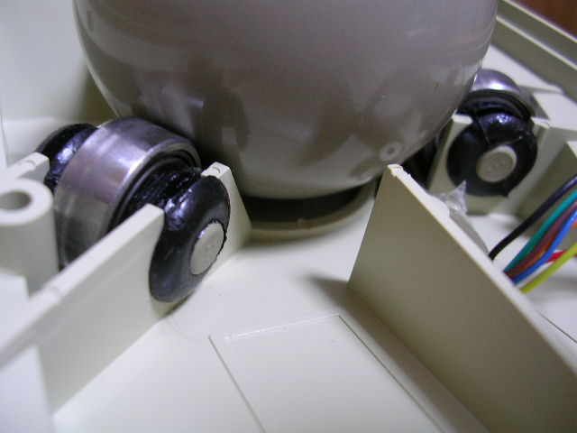 基板を外すと、ボールの支持機構が見えます。大型のベアリングをローラーとして用いる方法が当時から採られていたことがわかります。20年を経ても転がし感は変わりません。