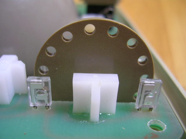本体側です。ベアリング側面の模様の反射を読む方式ではなく、ロータリーエンコーダが入っていました。この円盤の上部が、カバー側の突起になっていたのです。