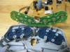 機構の要である回転センサ(2枚目)。L字の足が2本出ている発光体(肉眼では見えませんが)から照射した光がベアリング側面の縞模様で反射し、円筒形のレンズを通してセンサ(手前にある透明パーツの四角い部品)で検知されるという仕組みです。レンズの付近にホコリがたまると、縦または横軸のみ動かないと言う故障のような状態になります。そう簡単にそこまでホコリはたまりませんが。